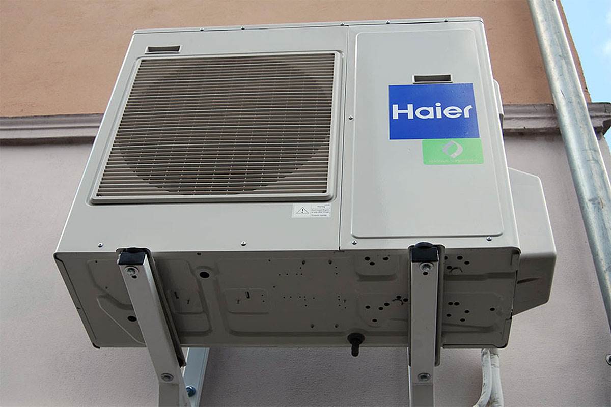 Specjalista REFSYSTEM – HAIER uzupełnia aspekty techniczne: „Jednostkę zewnętrzną montujemy na konstrukcji wsporczej typu L przytwierdzonej do ściany zewnętrznej budynku, możemy ją posadowić na konstrukcji nośnej na dachu obiektu lub na wylewce betonowej na specjalnych podporach. W przypadku klimatyzatorów z pompą ciepła bezwzględnie należy montować jednostkę zewnętrzną około 10 cm nad gruntem tak aby umożliwić odpływ i gromadzenie kondensatu powstałego w trakcie odszraniania agregatu zewnętrznego.