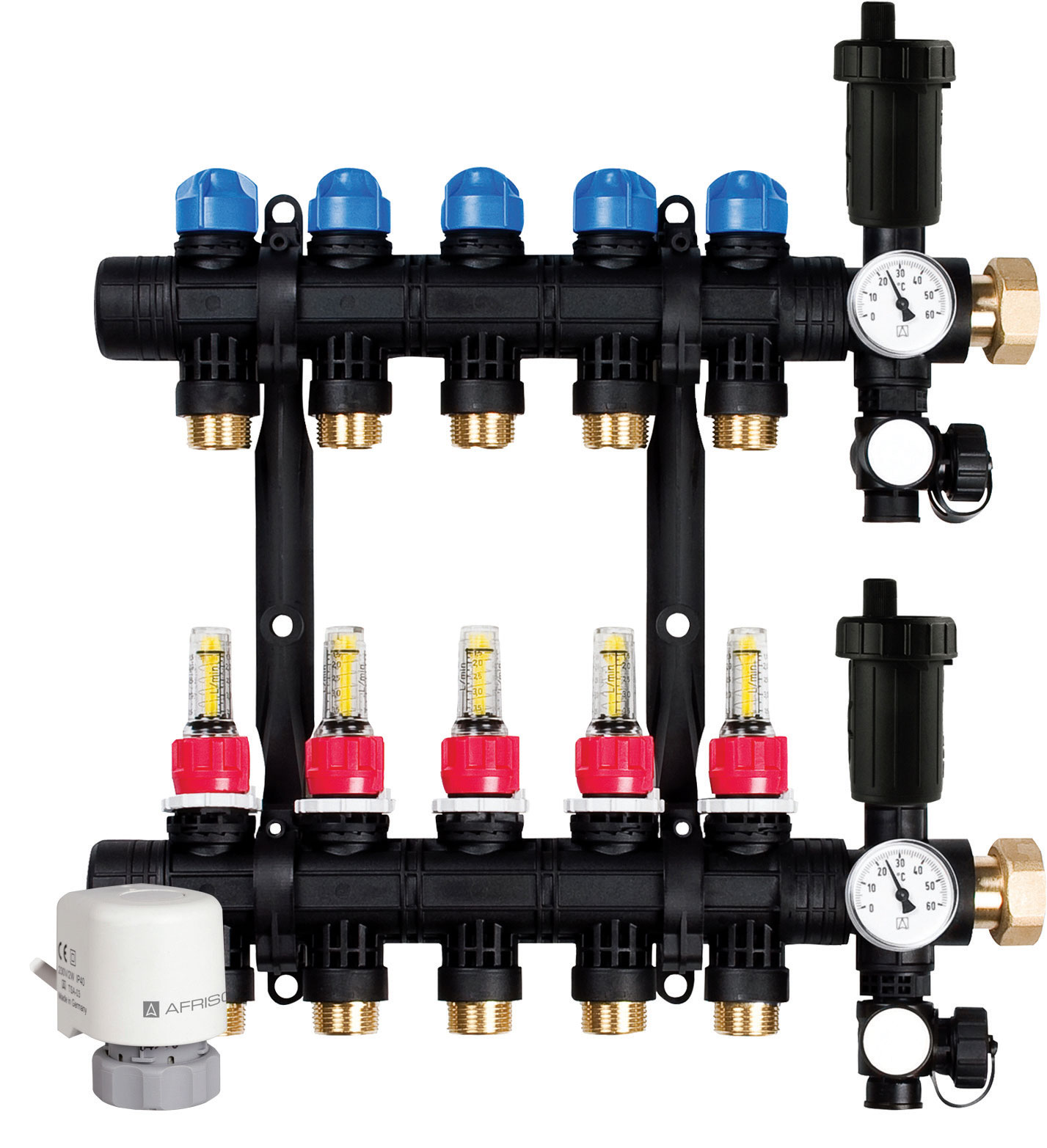 Wspomniane już rozdzielacze ogrzewania podłogowego wykonane z poliamidu (poliamid, PA 66) obsługują do 10 obiegów. Tak jak i w innych typach rozdzielaczy również i w tym przypadku, jako wyposażenie przewiduje się przepływomierze z zaworami regulacyjnymi, zawory termostatyczne, automatyczne odpowietrzniki poliamidowe, a także zawory do napełniania/opróżniania, termometry i elementy przedłużające.