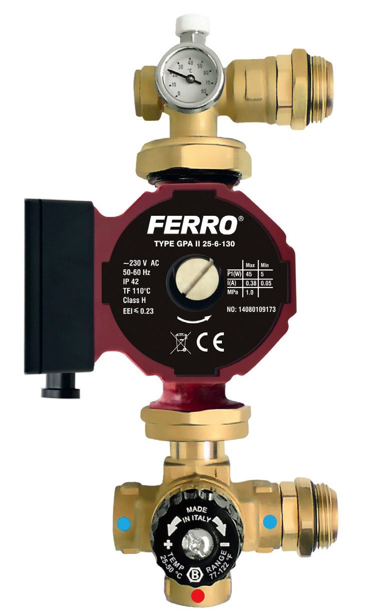 Standardowa grupa mieszająca bazuje na zaworze mieszającym, pompie elektronicznej, termometrze oraz odpowietrzniku ręcznym. Nabyć można grupy mieszające do rozdzielaczy 1” dla pompy 130 mm. Grupy tego typu bazują na zaworze mieszającym, termometrze, odpowietrzniku ręcznym oraz półśrubunkach do 1 1/2”. Ważne są również przyłącza do rozdzielacza z uszczelnieniem typu o-ring.