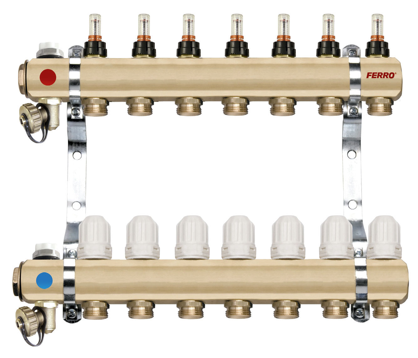 Na typowy rozdzielacz ogrzewania podłogowego składają się również zawory kulowe odcinające po stronie zasilania i powrotu, zawory odpowietrzające na belce powrotnej i zasilającej oraz zawory spustowo-napełniające, które również umieszcza się na obu belkach. W praktyce dużym uznaniem cieszą się gotowe rozdzielacze wraz z wyposażeniem. Zapewnia to gwarancję szczelności połączenia w porównaniu z samodzielnym złożeniem systemu rozdzielaczowego. Nabywając rozdzielacz wraz z kompletnym wyposażeniem obejmującym rotametry, zawory, odpowietrzniki, pompy itp. zyskuje się gwarancję na całościowy produkt.