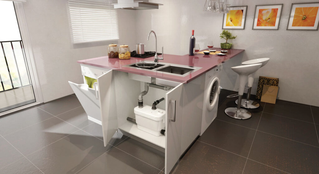 Wybierając pompę podobnie jak w przypadku pomporozdrabniaczy musimy zadać sobie pytanie jakie i ile przyborów chcemy do niej podłączyć. W małej kuchni bardzo dobrze sprawdzi się pompa SANISPEED lub SANIVITE. Są to bardzo wydajne pompy przeznaczonedo intensywnej pracy. Odprowadzają ścieki ze zlewozmywaków, umywalek i umożliwiają podłączenie wszystkich (z wyjątkiem WC) pozostałych urządzeń sanitarnych. Posiadają możliwość pompowania ścieków do 7 m w pionie lub do 70 m w poziomie. Maksymalna temperatura ścieków to 75°C dlatego też doskonale się sprawdzą przy podłączeniu zmywarki lub pralki. Moc silnika 400 W, klasa ochrony IP44. Przykładem urządzeń do obsługi kuchni jest również SANICOM 1. Jest to pompa przeznaczona do przepompowywania ścieków szarych (bez fekaliów) i wyposażona w jeden silnik o mocy 750 W. Tłoczy ścieki na wysokość 10 m