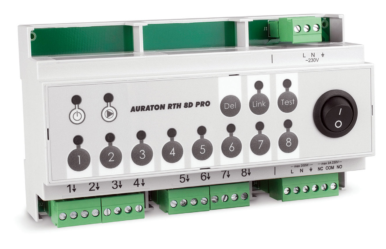 Fot. 2. Bezprzewodowa listwa sterująca siłownikami ogrzewania podłogowego przeznaczona do montażu w skrzynkach elektrycznych. AURATON RTH 8D PRO współpracuje z bezprzewodowymi regulatorami temperatury. Umożliwia jednoczesne sterowanie pracą pompy centralnego ogrzewania oraz urządzeniem grzewczym. Fot. LARS