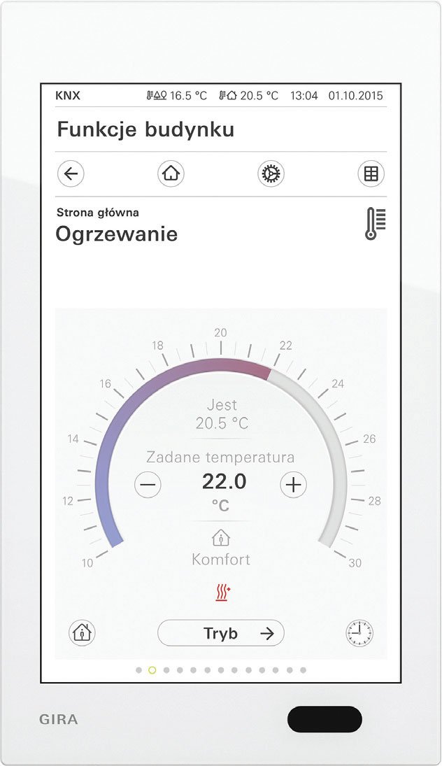 Fot. 7. Gira G1 jest genialnym rozwiązaniem, gdyż służy do sterowania wszystkim, co znajduje się w danym pomieszczeniu (również ogrzewaniem). A także poza nim. Pierwszą funkcję uruchamia się przez przyłożenie dłoni do urządzenia. To niezwykle wygodne, gdy wchodzi się do ciemnego pomieszczenia. Tym bardziej, że równocześnie podświetla się ekran umożliwiając wybranie dowolnej funkcji. Jedną z nich jest sterowanie ogrzewaniem oraz klimatyzacją. Przesuwając palcem po czytelnym wykresie można ustawić pożądana temperaturę. A lekkimi dotknięciami skorygować pożądany tryb pracy, który zwykle ustawiamy automatycznie za pomocą wbudowanego zegara sterowniczego. Czytelnie jest też wskazana aktualnie panująca w pomieszczeniu temperatura. Podobnie można sprawdzić temperaturę w każdym innym pokoju i w razie potrzeby skorygować ją. Bez potrzeby wędrowanie do innego pomieszczenia. Lista zalet Gira G1 jest znacznie większa, gdyż spełnia on także funkcję wideo domofonu, sterownika żaluzji i rolet oraz wyłącznika i ściemniacza oświetlenia. Dzięki temu, że instalacja komunikuje się także za pośrednictwem WiFi, można go zainstalować zawsze i niemal wszędzie. Fot. GIRA