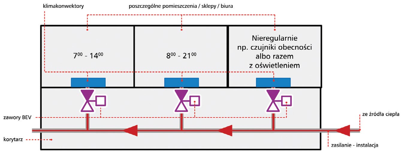 Wyobraźmy sobie centrum usługowo-biurowe, z lokalami przystosowanymi do odmiennej działalności, biurami o różnej kubaturze, funkcjonującymi w różnych godzinach. Każdy z nich przyłączony jest do głównej instalacji zasilającej je w grzanie lub chłodzenie. W takim przypadku trzeba podzielić instalację na strefy. Zawory strefowe z siłownikiem i małe obiegi grzewcze w bezobsługowy i w pełni zautomatyzowany sposób będą regulowały dopływ czynnika do obsługiwanych pomieszczeń.