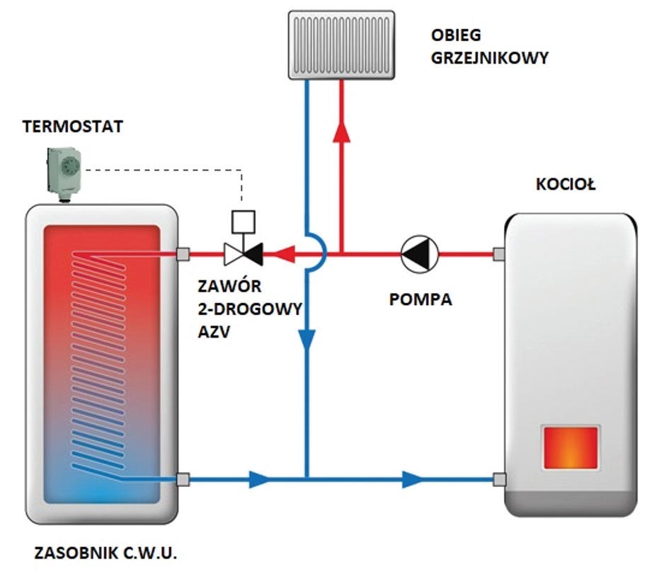 Z kolei aplikacja z zaworem 2-drogowym może bazować na jego połączeniu z termostatem, którego czujnik umieszczony w zasobniku będzie wymuszał na zaworze priorytet grzania wody użytkowej. Wraz ze spadkiem temperatury wody w zasobniku poniżej wartości ustawionej na termostacie, zawór otworzy obieg przez zasobnik, po czym woda zostanie podgrzana. W momencie osiągnięcia zadanej temperatury w zasobniku zawór zostanie zamknięty.